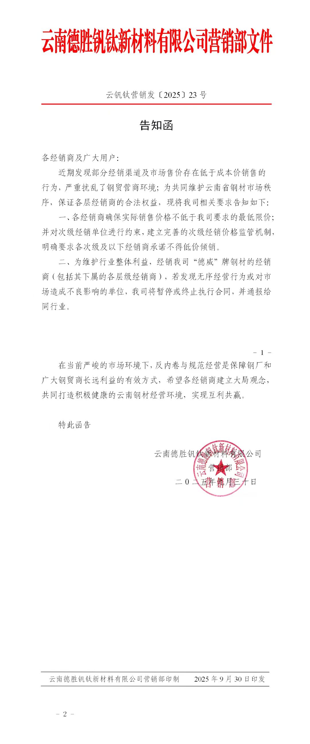 - 快讯:云南德胜钒钛新材料有限公司发布“反内卷”告知函2025/9/30