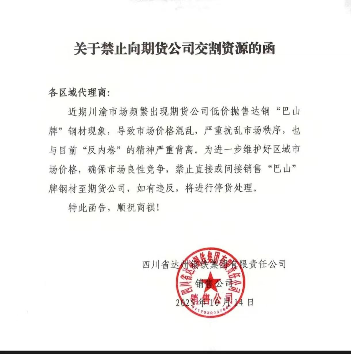 快讯:四川省达州钢铁集团有限责任公司发布“关于禁止向期货公司交割资源的函”