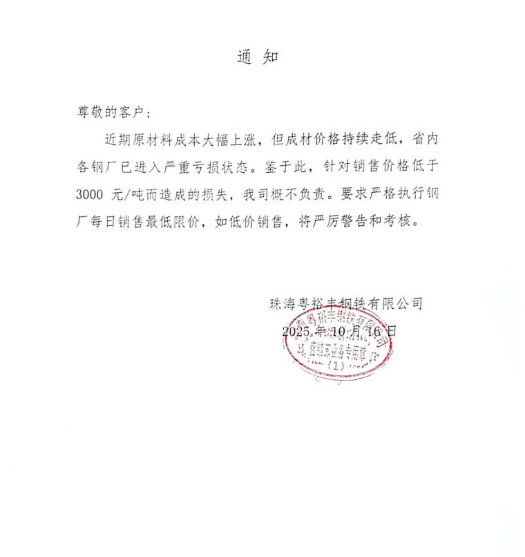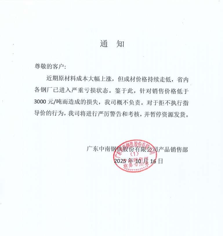 10月16日,广东中南钢铁股份有限公司、阳春新钢铁有限责任公司、珠海粤裕丰钢铁有限公司发布关于限价销售的通知。