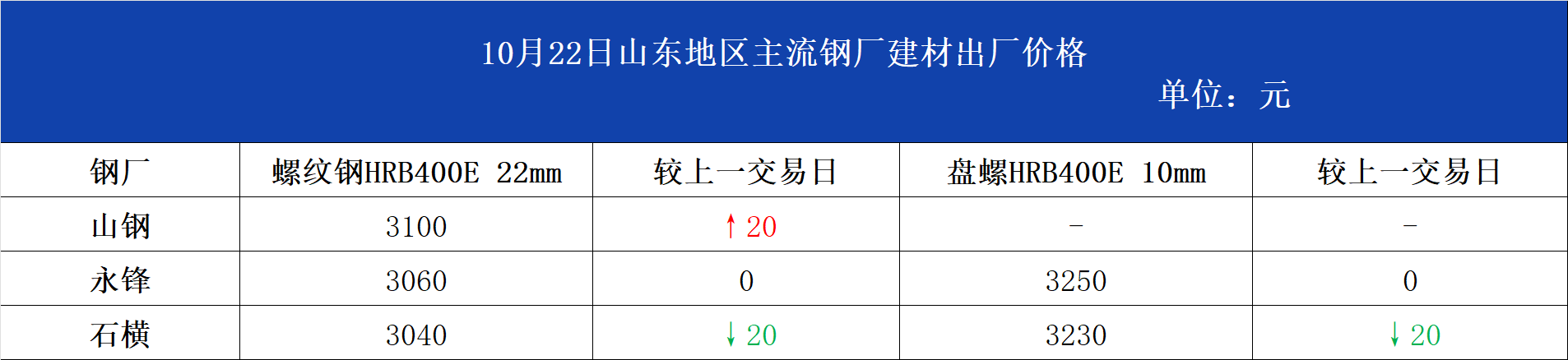 • 10月23日(14:30)山东地区主流钢厂建材出厂价格