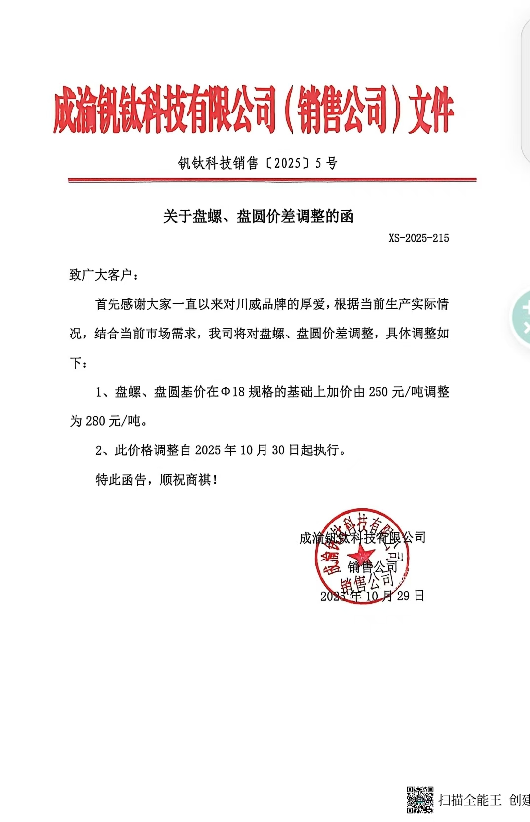 - 快讯:成渝钒钛科技有限公司关于盘螺、盘圆价差调整的函2025/10/30