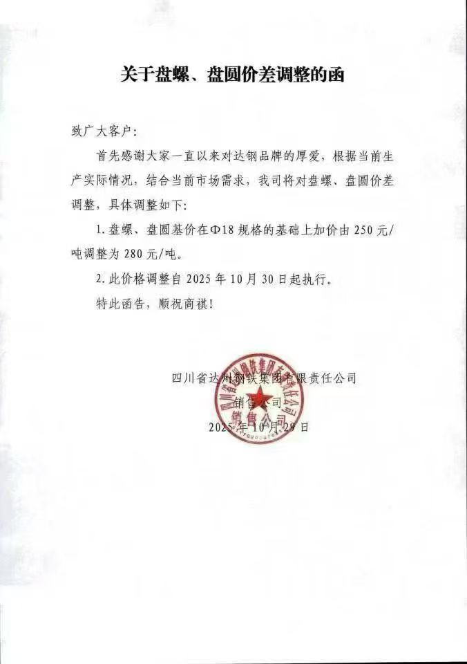- 快讯:四川省达州钢铁集团关于盘螺、盘圆价差调整的函2025/10/30