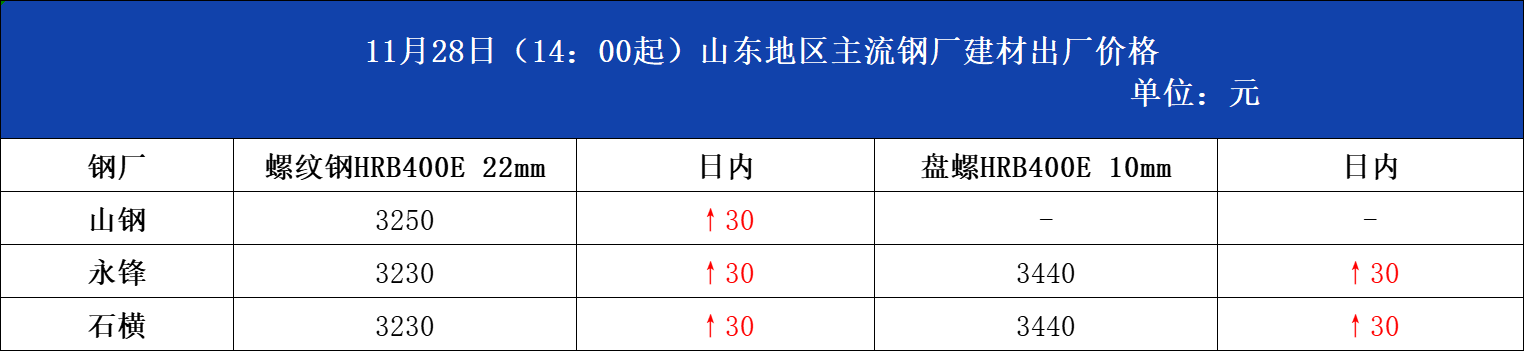 • 11月28日山东地区主流钢厂建材出厂价格