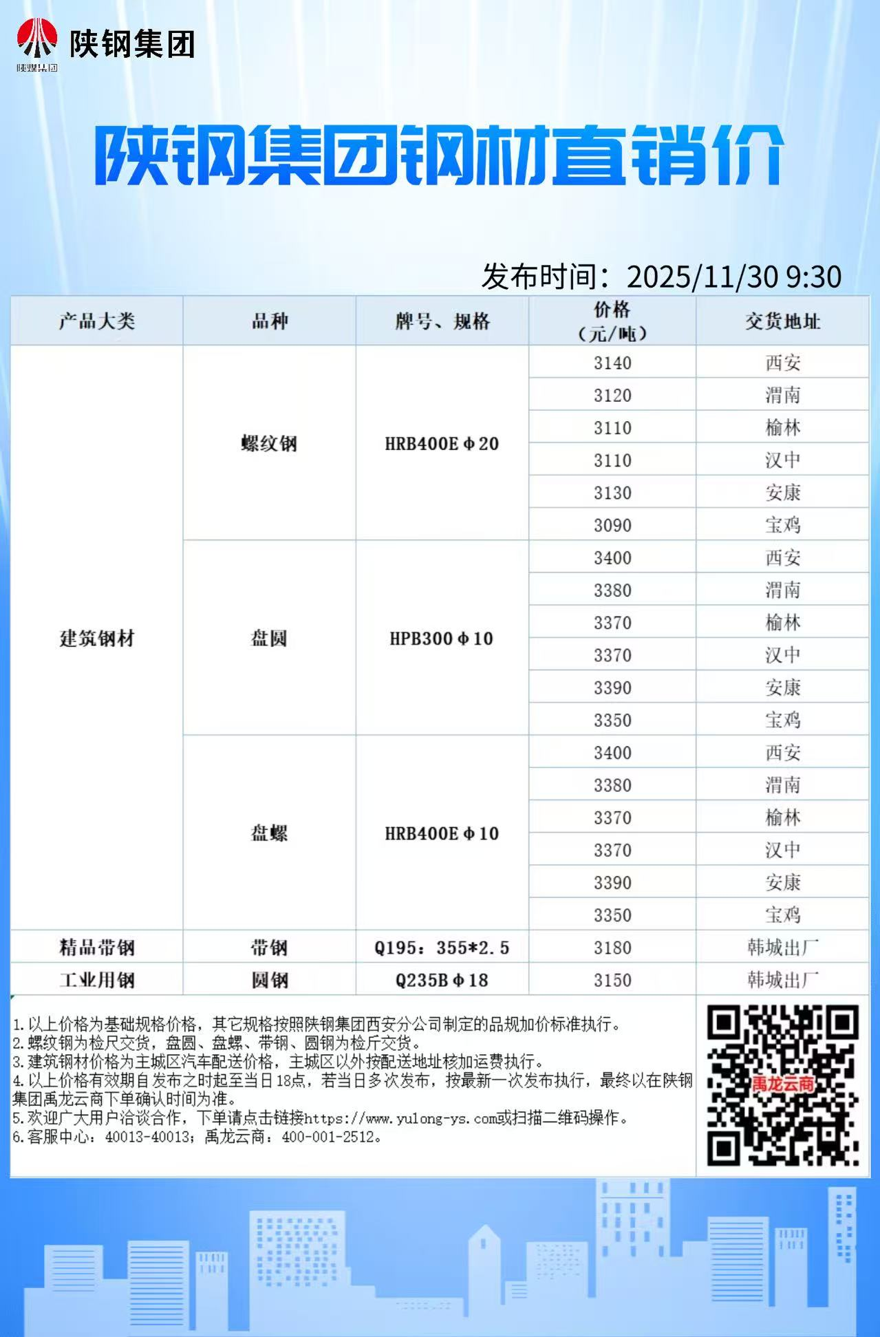 11月30日陕钢集团钢材直销价格信息