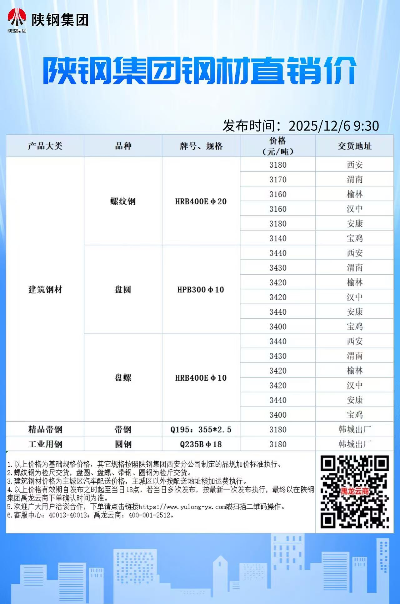 12月6日陕钢集团钢材直销价格信息