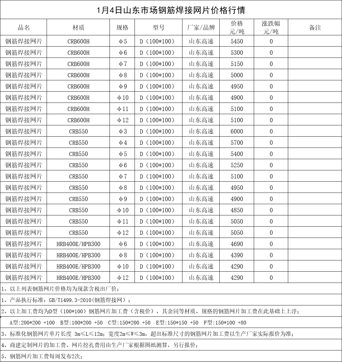 - 1月4日山东市场钢筋焊接网片价格行情2026/1/4