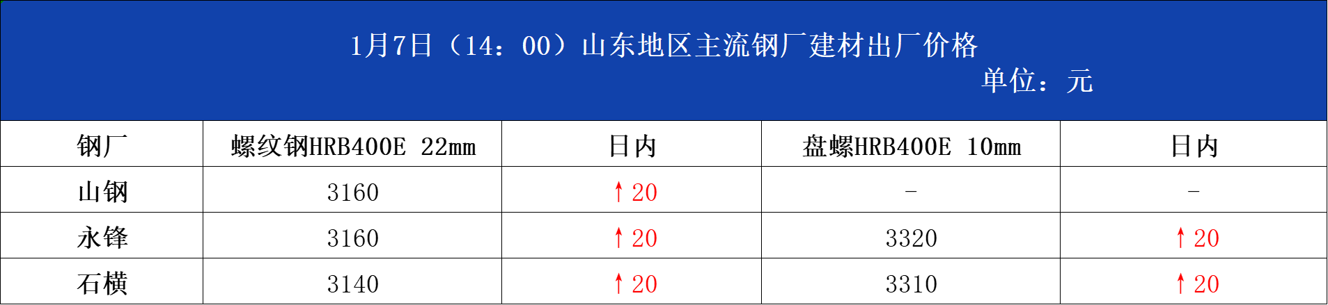 • 1月7日(14:00)山东地区主流钢厂建材出厂价格