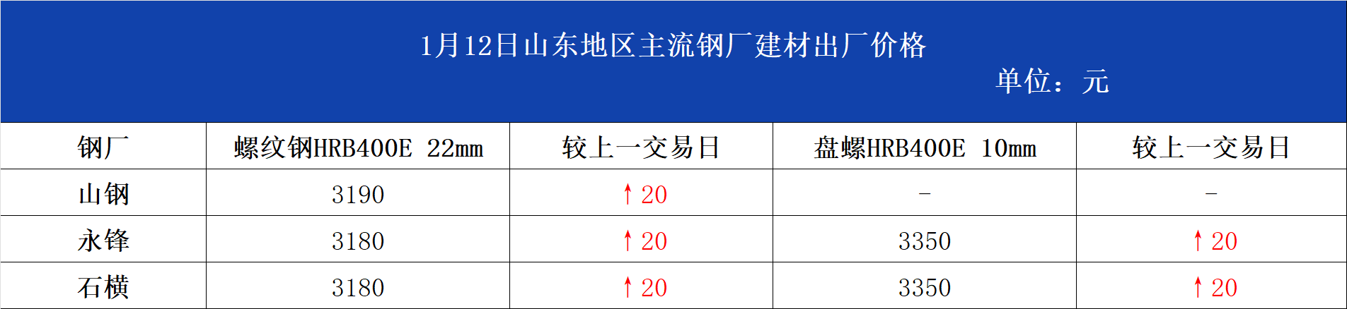 • 1月12日山东地区主流钢厂建材出厂价格