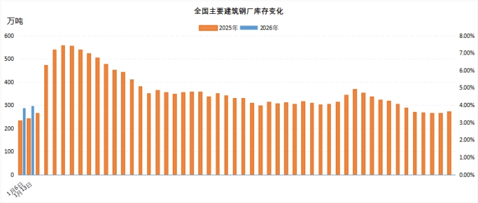 本周全国主要地区样本钢厂建筑钢材的厂内库存量296.4万吨,相较于上期增加8.2万吨,增幅为2.8%,和去年同期相比增22.7%。多数地区库存小幅减少,部分地区库存显著增加,整体来看,本周钢厂库存仍呈现小幅增加趋势。库存增长具体情况为:河北区域增幅3.8%,西南区域增幅16.2%,西北区域增幅5.2%。库存减少具体情况为:山西区域减幅4.8%,山东区域减幅6.7%,河南区域减幅9.1%,福建区域减幅8.4%,广东区域减幅8.4%,华中区域减幅12.4%。受钢价反弹影响,市场交易氛围趋于活跃,下游采购节奏加快,多地钢厂库存出现下降。河北地区前期受环保限产影响的钢厂陆续复产,供应有所恢复,钢厂库存小幅累积。西北地区受冬季降温影响,下游需求迅速收缩,钢厂库存持续增加。综合来看,随着钢厂逐步复工,预计下周建材供应将继续回升;本期需求增长主要受期货盘面及市场情绪带动,实际需求改善有限,淡季特征依然明显。预计下周钢厂库存或将继续小幅累积。