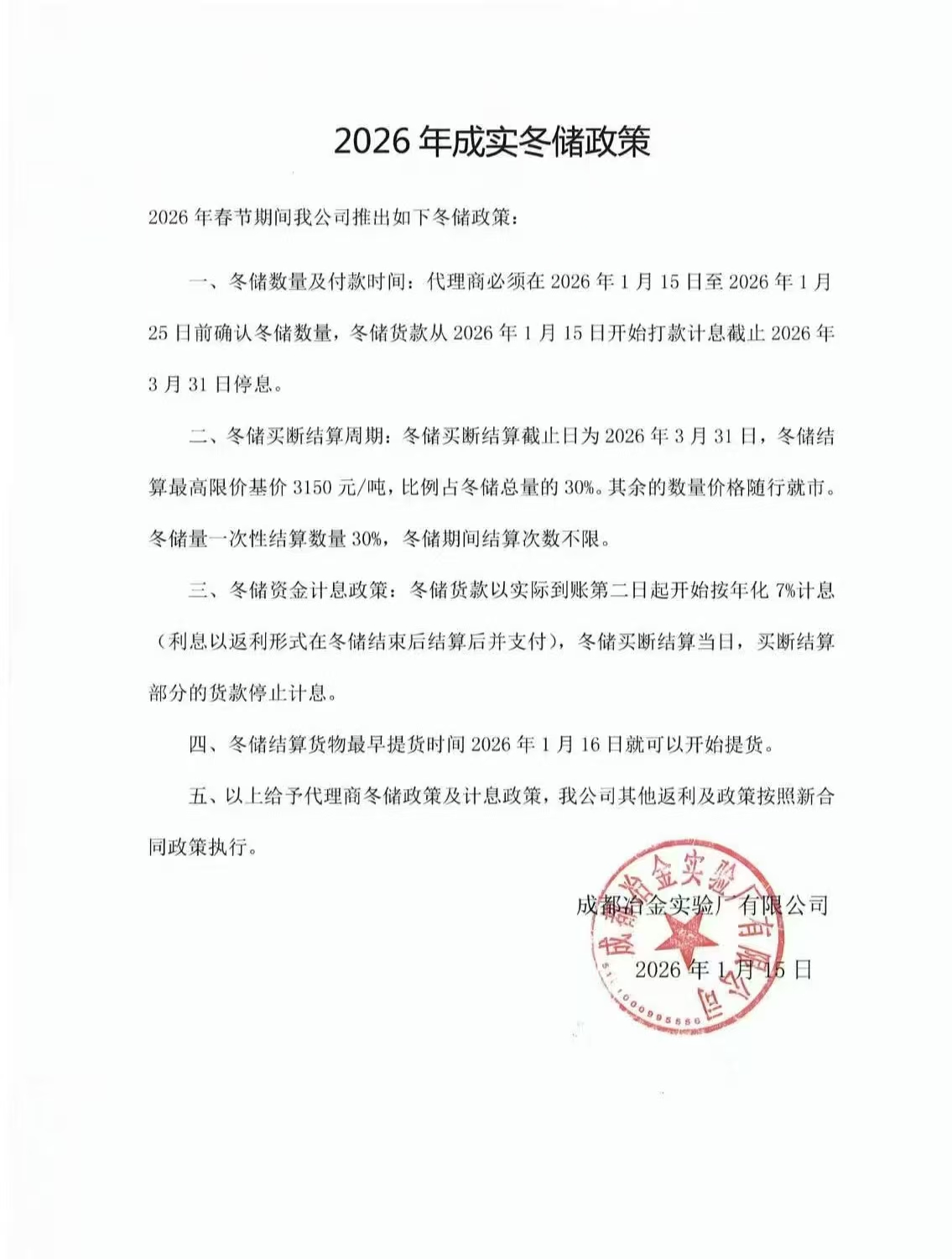 一、冬储数量及付款时间:代理商必须在2026年1月15日至2026年1月25日前确认冬储数量,冬储货款从2026年1月15日开始打款计息截止2026年3月31日停息。