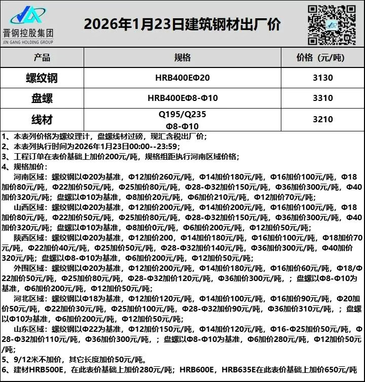 1月23日山西晋钢建筑钢材出厂价格