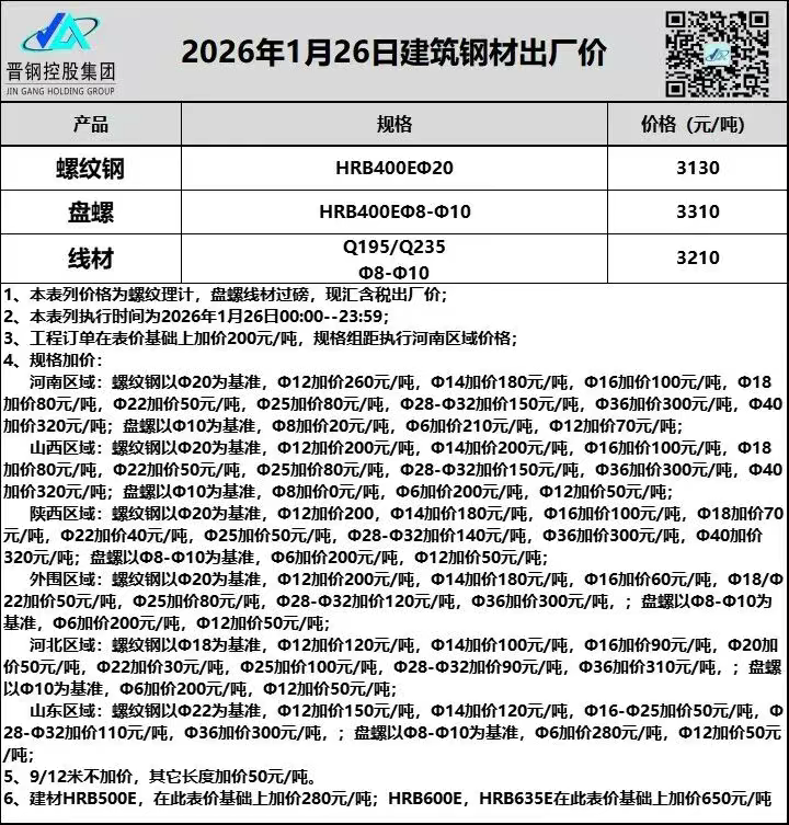 1月26日山西晋钢建筑钢材出厂价格