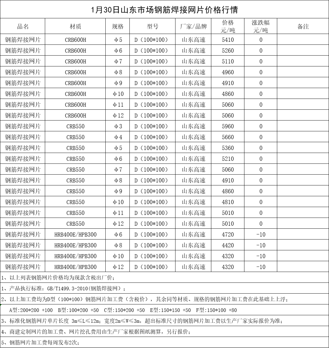 1月30日山东市场钢筋焊接网片价格行情