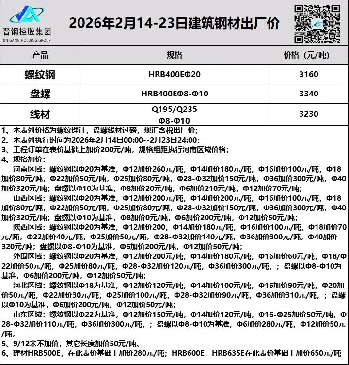• 2月14-23日山西晋钢建筑钢材出厂价格