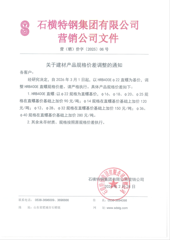 - 石横特钢集团关于建材产品规格价差调整的通知2026/2/28