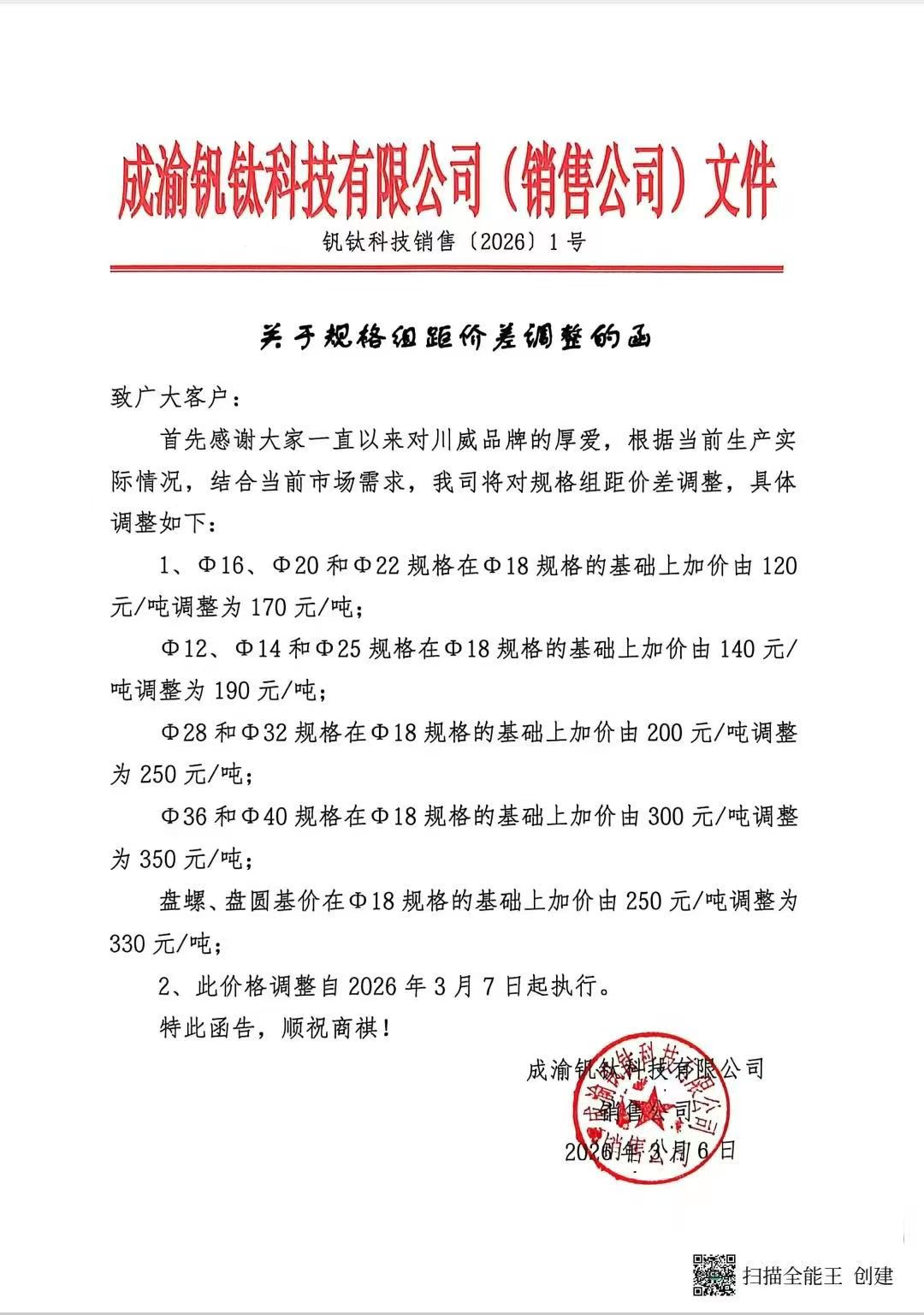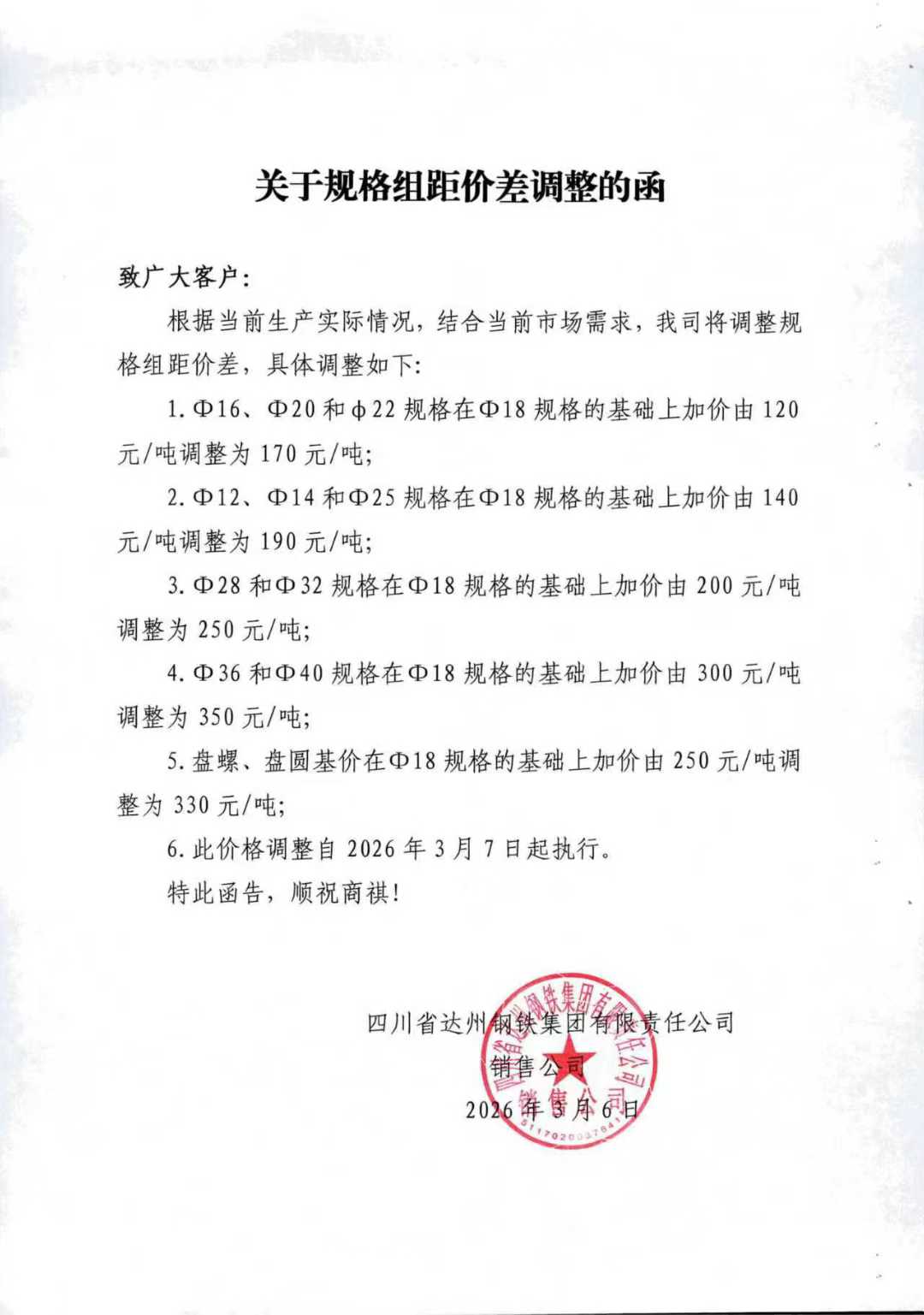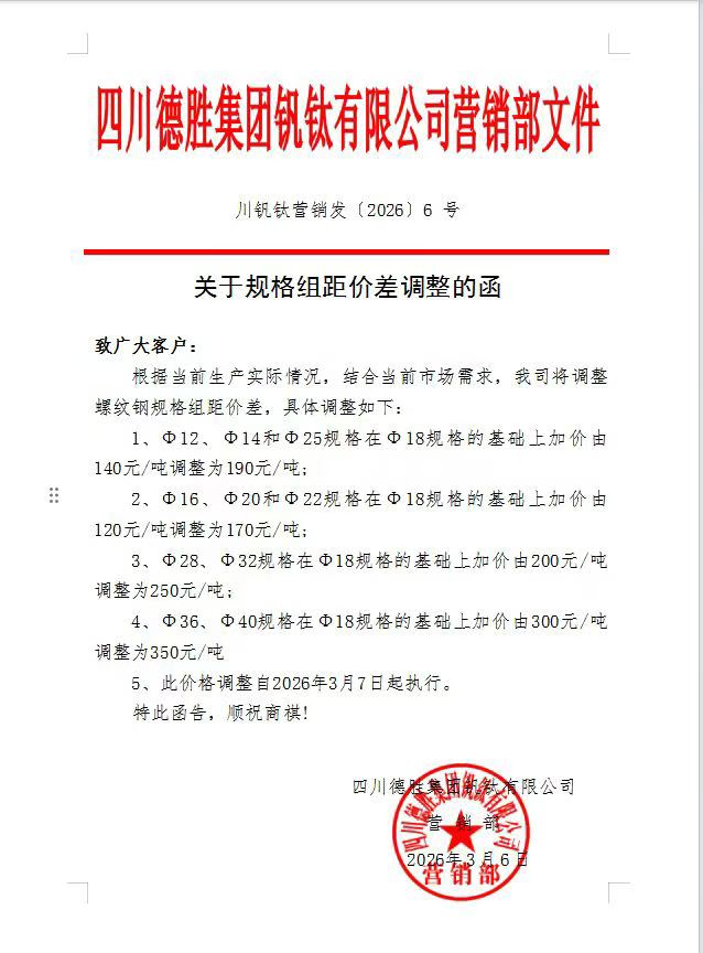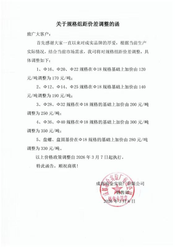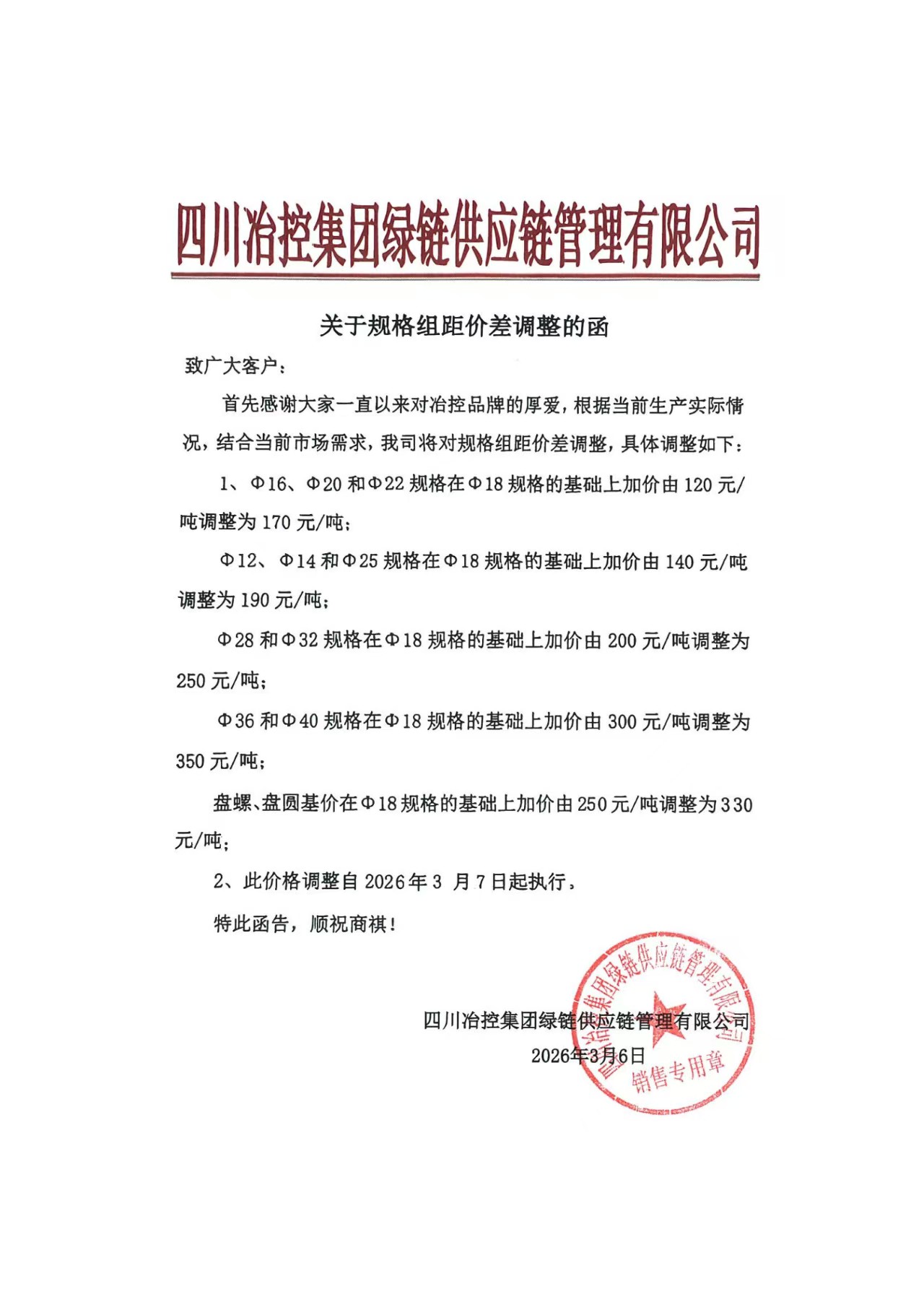 四川区域钢厂发布“关于规格组距价差调整的函”