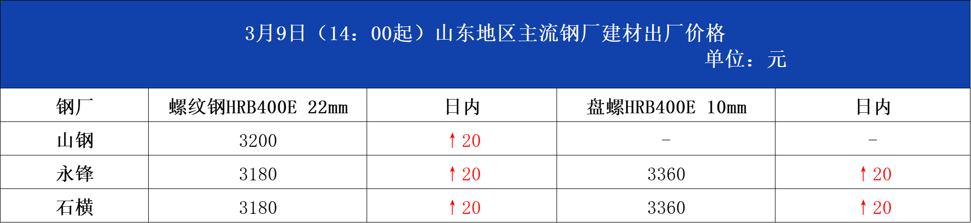 • 3月9日(14:00起)山东地区主流钢厂建材出厂价格