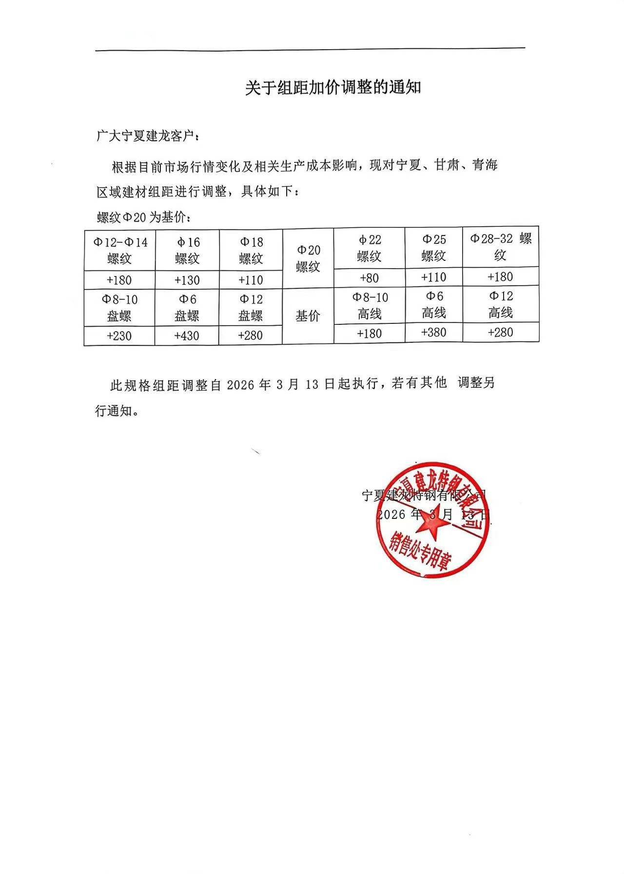 快讯:宁夏建龙特钢关于组距加价调整的通知