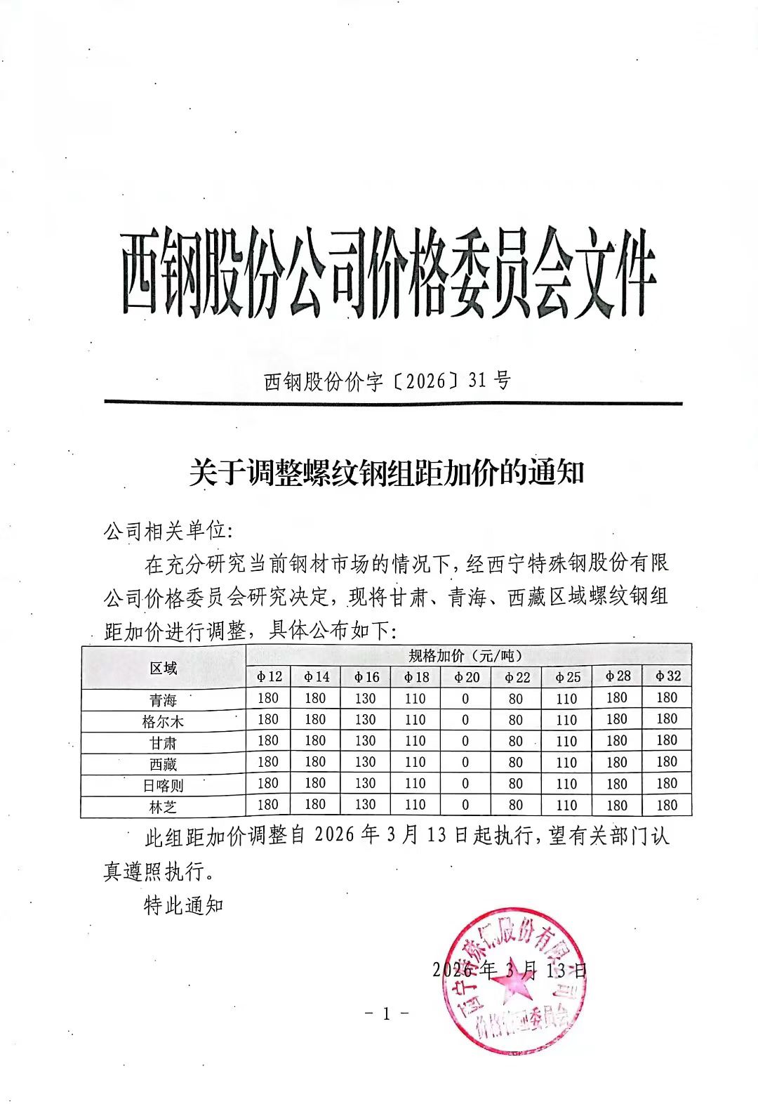 在充分研究当前钢材市场的情况下,经西宁特殊钢股份有限公司价格委员会研究决定,现将甘肃、青海、西藏区域螺纹钢组距加价进行调整,具体公布如下: