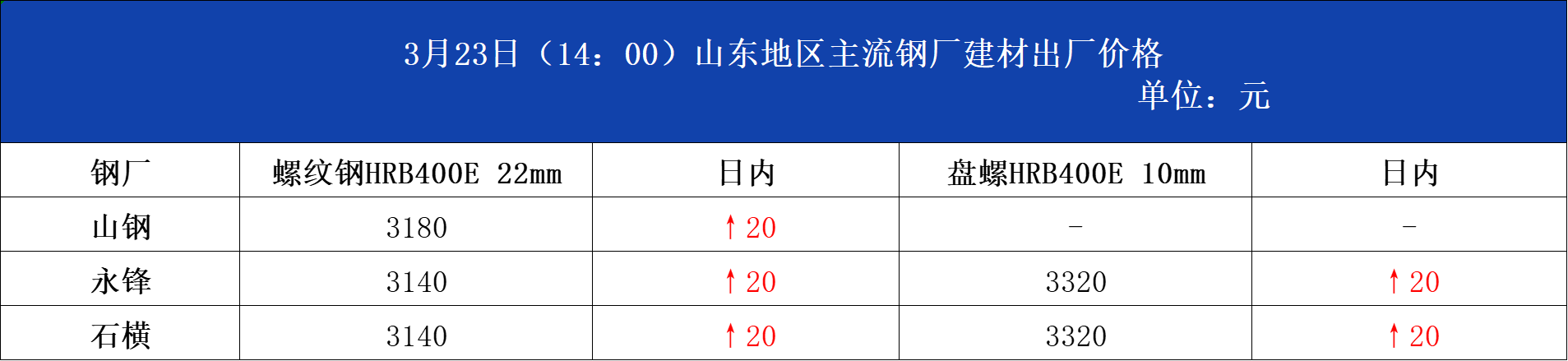 • 3月23日(14:00)山东地区主流钢厂建材出厂价格