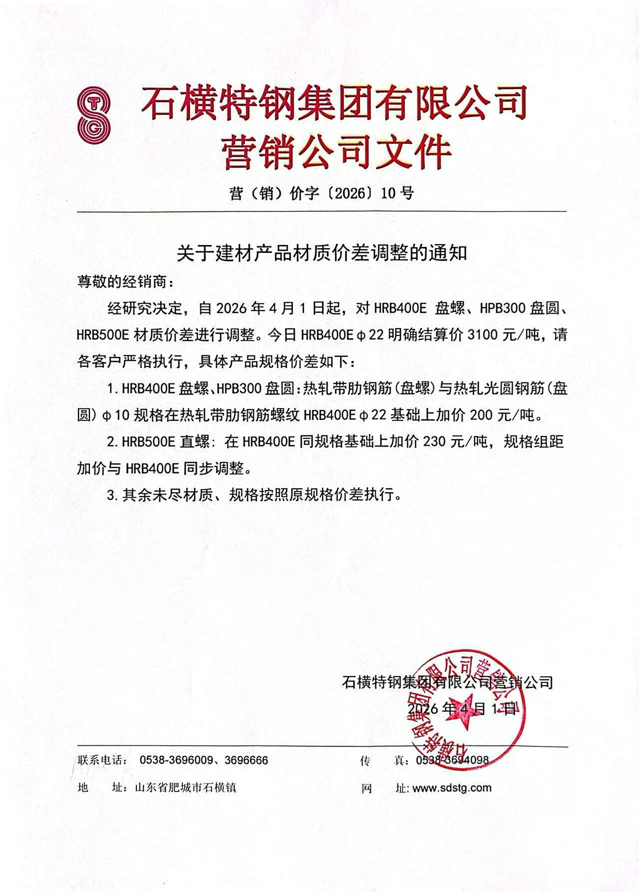 - 石横特钢集团关于建材产品规格价差调整的通知2026/4/1