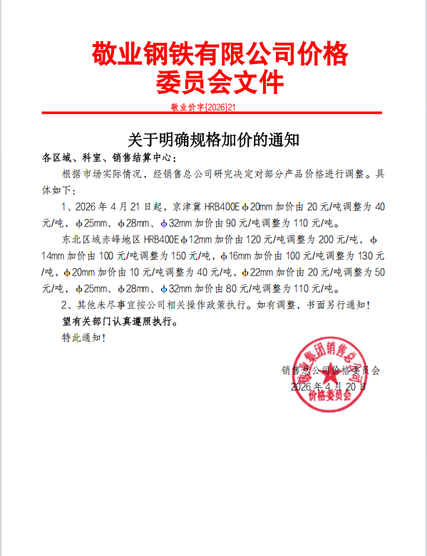1、2026年4月21日起,京津冀HRB400Eφ20mm加价由20元/吨调整为40元/吨,φ25mm、φ28mm、φ32mm加价由90元/吨调整为110元/吨。
