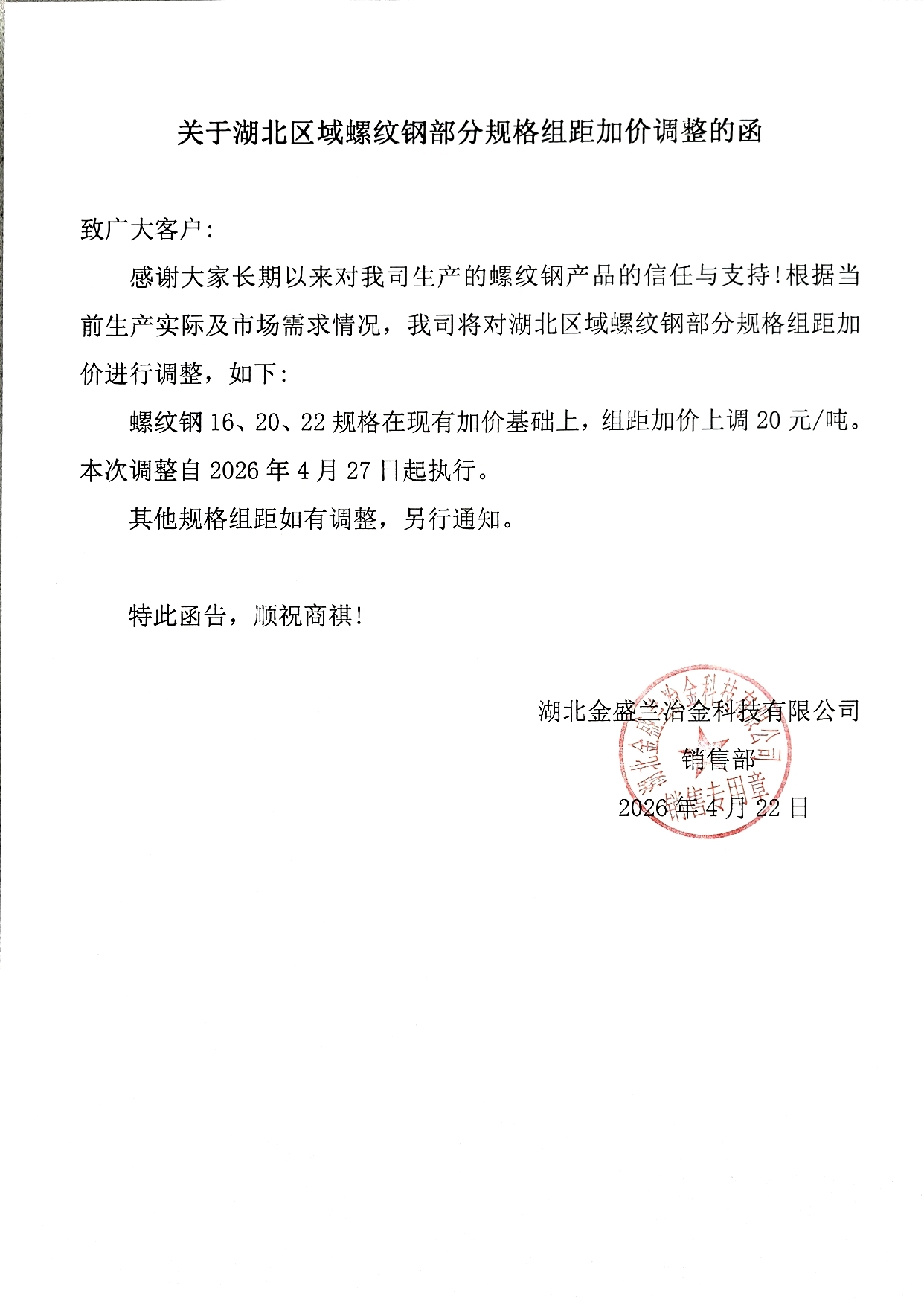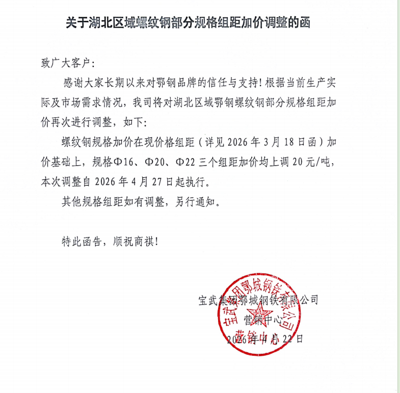 快讯:湖北区域钢厂发布“关于规格组距价差调整的函”
