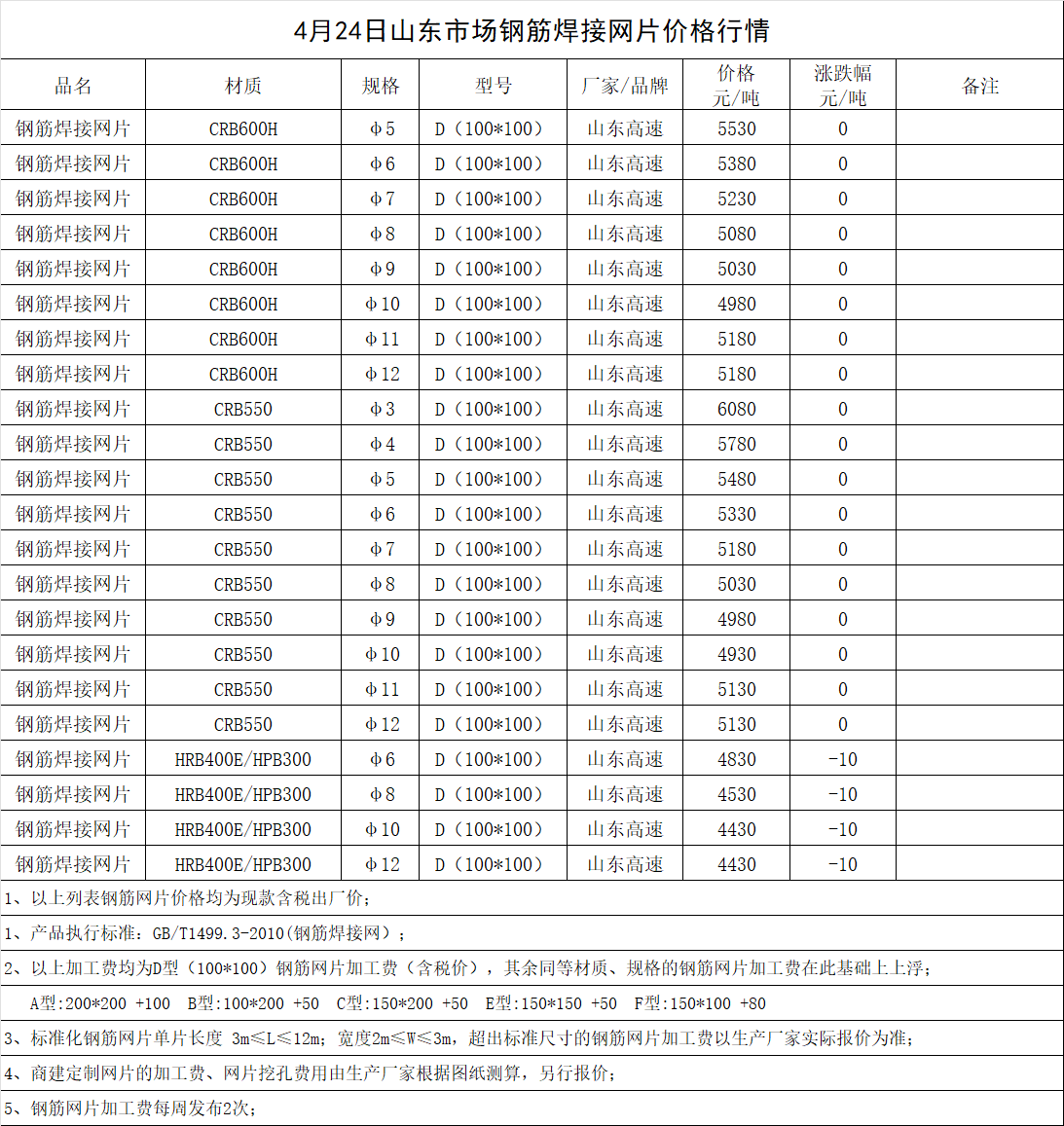 4月24日山东市场钢筋焊接网片价格行情